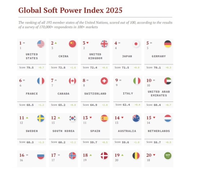 เพื่อให้เห็นแนวทางในการพัฒนาเศรษฐกิจจาก Soft Power ของเกาหลีใต้นั้น เราควรศึกษาจากการประกาศผล Global Soft Power Index 2025 โดย Brand Finance ซึ่งวัดค่าดัชนี Soft Power ของแต่ละประเทศ และดัชนีนี้มีความผันตรงคล้ายคลึงกับการจัดอันดับการวัดผลิตภัณฑ์มวลรวมภายในประเทศ (GDP) ของประเทศที่พัฒนาแล้ว 20 อันดับแรก