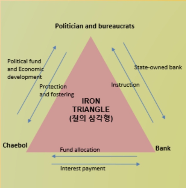 แต่เกาหลีใต้สามารถทำการใหญ่นี้ได้ไม่ยาก เนื่องจากเกาหลีนำโครงสร้างการพัฒนายุทธศาสตร์ประเทศมาจากญี่ปุ่นที่เรียกว่า “โครงสร้างสามเหลี่ยมเหล็ก” ซึ่งเป็นความร่วมมือกันระหว่าง 3 ส่วน คือ ภาครัฐบาลรวมถึงข้าราชการทุกหน่วยงาน ภาคเอกชน และภาคสถาบันการเงิน ดังภาพประกอบ