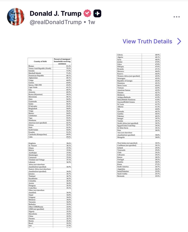 ดร.กอบศักดิ์ ภูตระกูล กรรมการรองผู้จัดการใหญ่ ธนาคารกรุงเทพ อธิบายไว้ในเฟซบุ๊กส่วนตัว Kobsak Pootrakool ว่า เมื่อวันที่ 4 มกราคม 2569 ที่ผ่านมา ทรัมป์เคยโพสต์รายชื่อประเทศที่ผู้อพยพพอเข้าสหรัฐฯ มาแล้ว ต้องมาอาศัยพึ่งพาระบบสวัสดิการของสหรัฐ ในการยังชีพ โดยบางประเทศมีสัดส่วนครัวเรือน ที่ใช้สวัสดิการสหรัฐที่สูงมาก