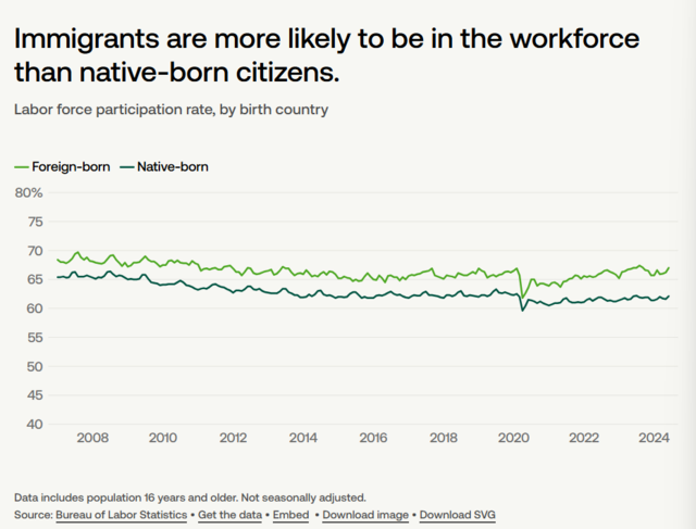 อัตราการมีส่วนร่วมในกำลังแรงงานของผู้อพยพคือ 67.0% เมื่อปี 2024 ขณะที่คนสหรัฐฯ นั้นอยู่ที่ 62.1% ในช่วงเวลาเดียวกัน และหากเรามองกราฟด้านล่างนี้ ก็จะสรุปความอย่างง่ายได้ว่า “สัดส่วนผู้อพยพที่ทำงานนั้นมากกว่าคนที่เกิดในสหรัฐฯ มาหลายปีแล้ว”