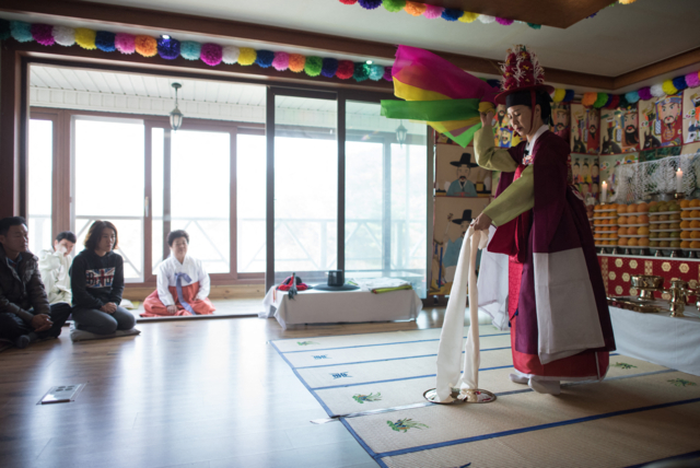 ในตำหนักของอี คยองฮยอน หรือเจ้าของฉายา “เทพธิดาเด็ก” แสงเทียนสว่างไสว จุดขึ้นเพื่อบูชาพระพุทธรูปและเทพเจ้าท้องถิ่นที่เธอเคารพนับถือ แม้ดูจากภายนอก เธอคือหญิงสาวอายุยังไม่มาก ที่สวมใส่ชุดฮันบก ชุดประจำชาติของเกาหลีใต้ แต่เธอบอกกับเราว่า เธอคือร่างทรง ผู้สื่อสารระหว่างโลกที่มองไม่เห็นกับมนุษย์