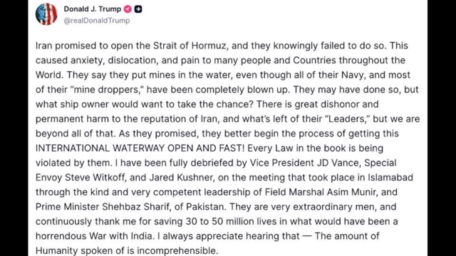 ประธานาธิบดีทรัมป์ยังโพสต์ผ่าน Truth Social ด้วยว่า สหรัฐฯ ยังคงอยู่ในสถานะพร้อมรบเต็มที่ และกองทัพมีความพร้อมที่จะ “จัดการกับอิหร่านให้จบสิ้น” ในช่วงเวลาที่เหมาะสม