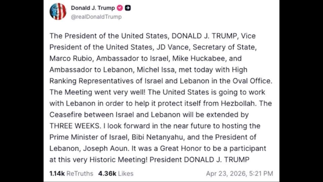 สถานการณ์ความขัดแย้งระหว่างอิสราเอลและเลบานอนมีความเคลื่อนไหวครั้งสำคัญ เมื่อประธานาธิบดีโดนัลด์ ทรัมป์ ได้ออกมาประกาศว่าข้อตกลงหยุดยิงระหว่างทั้งสองประเทศจะถูกขยายออกไปอีก 3 สัปดาห์ หลังจากมีการเจรจารอบใหม่ระหว่างทูตของทั้งสองฝ่ายที่ทำเนียบขาวเมื่อวันที่ 23 เมษายนที่ผ่านมา